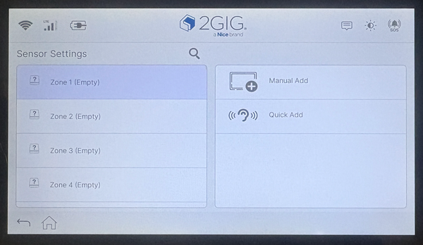 Open Sensor Settings. Tap Sensor Settings from the Installer menu. The screen displays all 128 available zones in the left panel, with Manual Add and Quick Add options in the right panel.