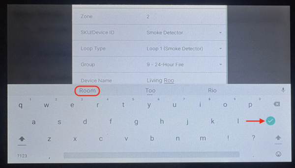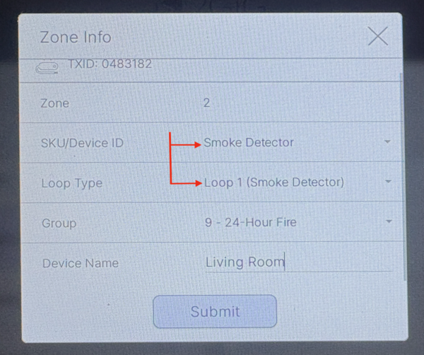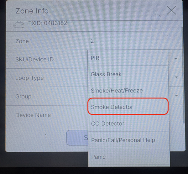 Configure the zone settings. Select the smoke detector model or type from the SKU/Device ID dropdown. In our example, the smoke detector is a Honeywell 5808W3. Once we learn it in and choose Smoke Detector from the available list of device types, the Loop Type and Group is automatically filled in. Verify the setting is correct for the device you're using. For smoke detectors, the Group should be set to either (9) 24-Hour Fire or (16) 24-Hour Fire Verification. Tap the Device Name space and give the detector a name. This is how the zone will be displayed in the panel's Event History.