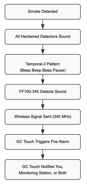 The 2GIG FF100-345 is a popular option for this purpose. This device mounts near an existing smoke detector and uses a built-in microphone to listen for the standard Temporal-3 alarm pattern, which follows a repeating cadence of three beeps, a pause, then three more beeps and another pause. This cadence repeats over and over, usually until smoke clears. When the FF100-345 detects this pattern, it transmits a 345MHz wireless signal to your GC Touch.