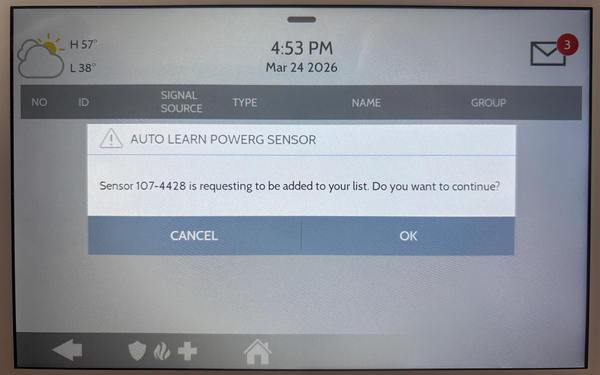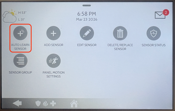 Tap Auto Learn Sensor. This will put the panel into listening mode. The panel begins scanning for new sensor signals. It will detect sensors automatically when they are tripped or tampered.