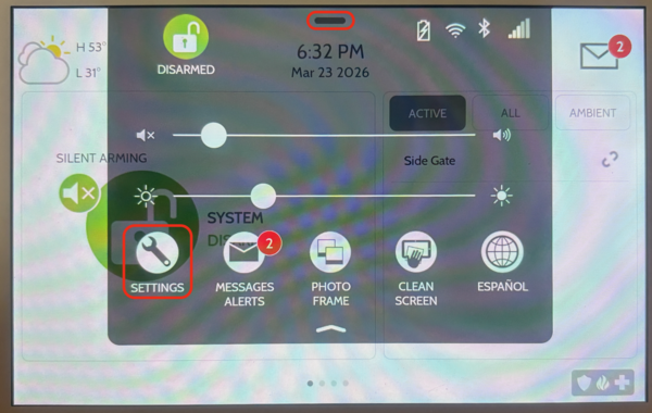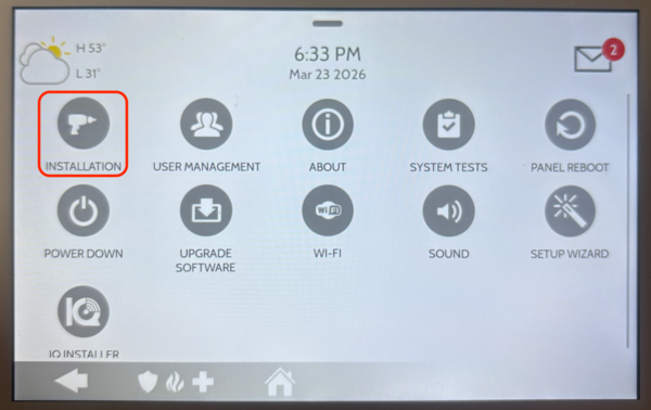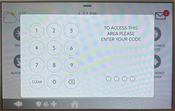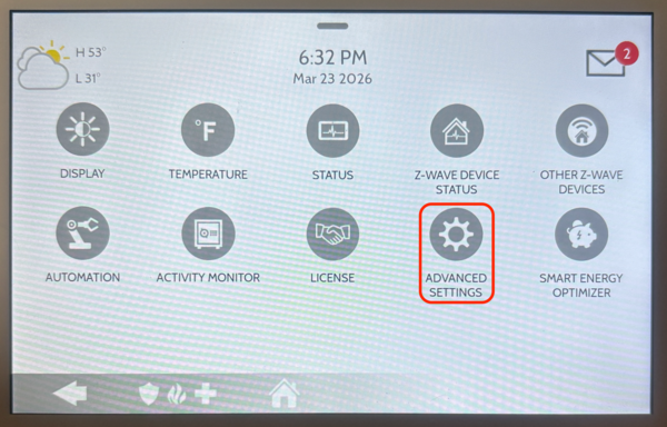 Tap Advanced Settings. Within the Settings menu you'll see several options such as Display, Temperature, Z-Wave Device Status, Advanced Settings, and more. When you tap Advanced Settings, a numeric keypad appears on screen and you'll be prompted to enter a code. Enter the Installer Code (default 1111). This will bring you to the Advanced Settings menu.