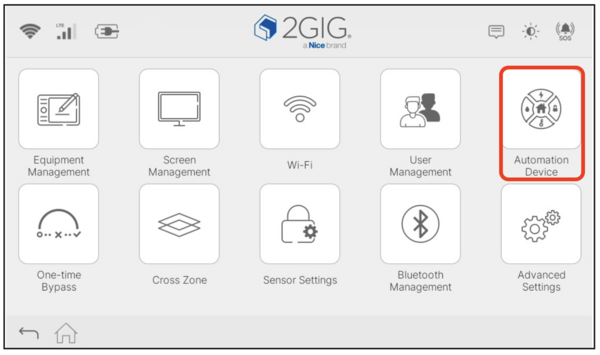 To add a Z-Wave thermostat to the 2GIG GC Touch, disarm the panel and tap Settings (gear icon). Enter the Installer Code (1561 by default), tap Automation Device, and select Add Device. Trigger the pairing mode on your thermostat, and the panel will then detect and enroll the device.