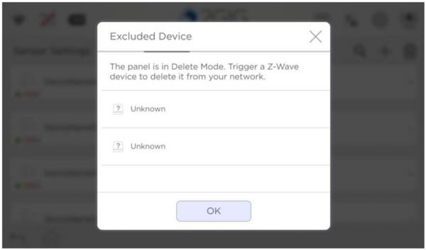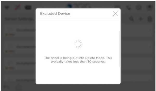 - Tap Remove Device. The panel will enter the removal (Delete) Mode within 30 seconds and begin scanning for Z-Wave devices. A message confirms the panel is actively searching for devices to exclude.