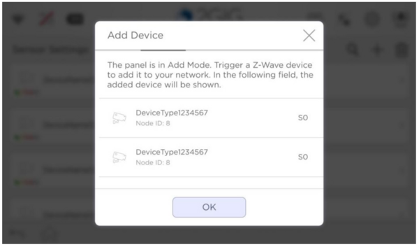Tap Add Device. Once the thermostat has been successfully excluded, you can add it to the system. Tapping Add Device will enter inclusion mode. At this point, the panel is now listening for the thermostat pairing request. Activate the inclusion/add function on the thermostat. The panel will let you know once it detects the device.