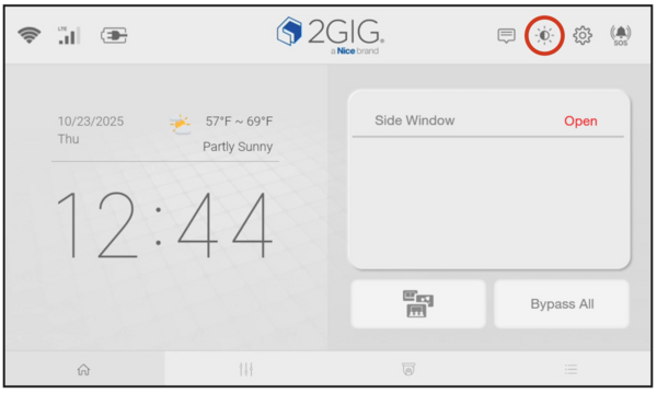 The 2GIG GC Touch provides two convenient methods for adjusting the screen's brightness. Users can access the brightness slider from the Home screen by tapping the sun icon, or edit the brightness through the Settings menu under Screen Management. All brightness changes are applied instantly.