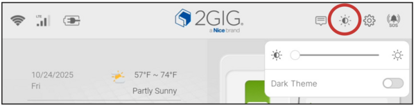 Adjusting brightness on the 2GIG GC Touch takes just a few taps using the sun icon on the Home screen. The slider bar and Dark Theme toggle give you full control over display comfort. For help with screen settings or other features on your GC Touch panel, contact the Alarm Grid support team.