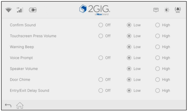 - Door Chime: Sets the volume of the "ding-dong" sound when chime-enabled sensors trigger.