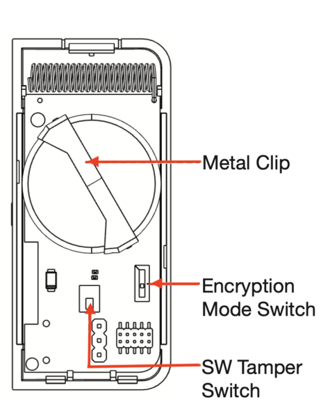 - Tap the tamper switch 5 times. This step is required to register the new encryption mode setting. The tamper switch is the small button located inside the housing.