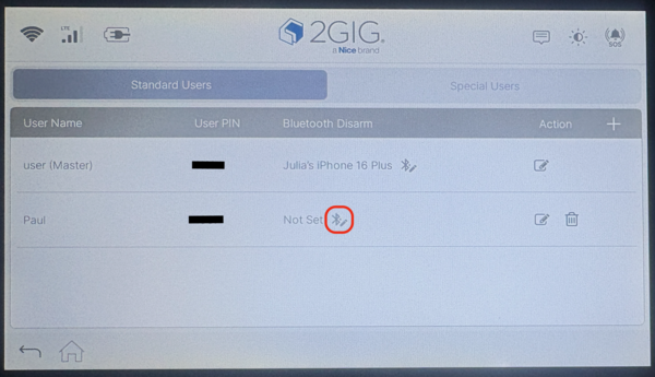 - Select a user account. Tap on the user you want to associate with Bluetooth Disarming. Each paired phone must be linked to a specific user code.