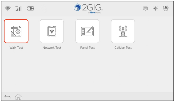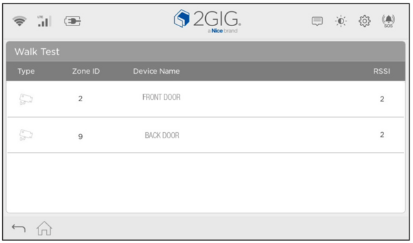 Walk Test is a diagnostic feature on the 2GIG GC Touch (available in AT&T LTE and Verizon LTE versions) that allows you to verify sensor signal strength throughout your home. After sensors have been programmed into the panel, this test confirms each device can effectively communicate with the security system. When you trigger each sensor during the test, the panel displays the device name, zone ID, and RSSI (Received Signal Strength Indicator) value.