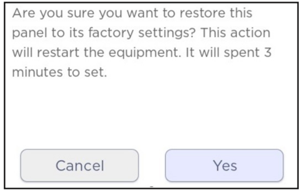 Confirm the reset. Tap Submit, then tap Yes on the confirmation screen. The message warns that the panel will restart and the process takes about 3 minutes. Once you tap Yes, the reset cannot be stopped.