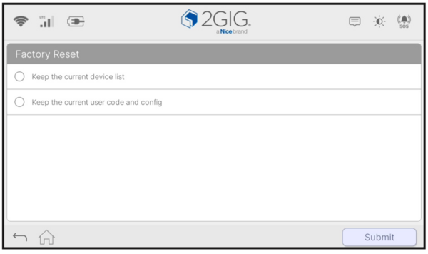 Choose data to keep. Select which data, if any, to preserve before proceeding. There are two options: keep the current device list, and keep the current user codes and configuration. For a full factory reset, leave both options unchecked and tap "Submit."