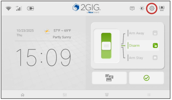 - Disarm the system. The panel restricts access to the Settings menu when armed in either Away or Stay mode. If you attempt to access Settings while armed, the screen displays a message stating "The operation is not allowed while the system is armed." Ensure the system shows Disarmed status before proceeding.