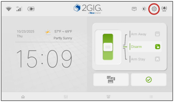 Disarm the system. Be sure the system is disarmed. The panel restricts access to Settings when armed in either Away or Stay mode.