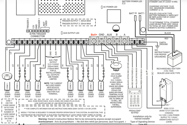 Add all device current draws together to get your total AUX load. If this total approaches or exceeds the panel’s AUX output rating of 950mA, you should plan to use a separate, regulated 12VDC power supply with backup battery.