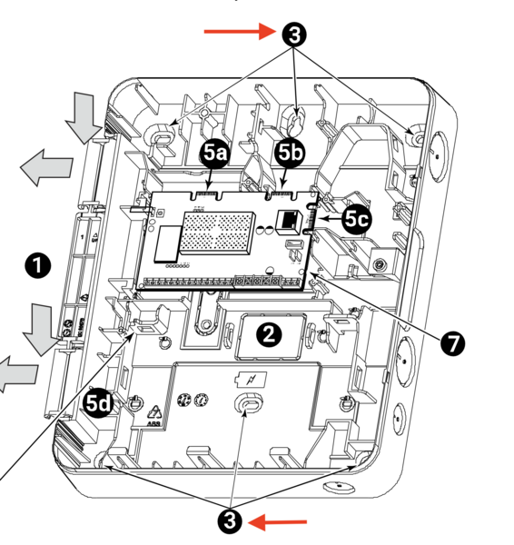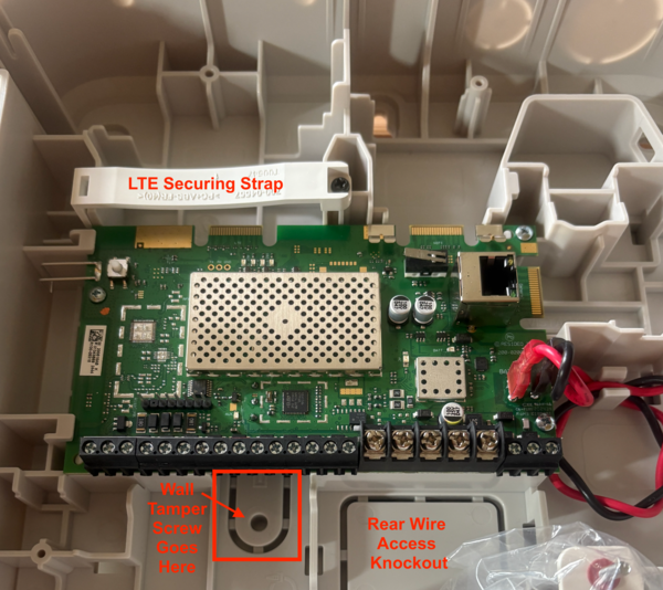 - Install LTE communicator. Install the PROLTE-A2 or PROLTE-V2 on the panel's top left edge connector. If your panel has a factory-installed securing strap (as shown in the image above), remove the screw and strap first. Slide the PROLTE communicator into place over the edge connector. Finally, replace the strap and install the screw to secure it.