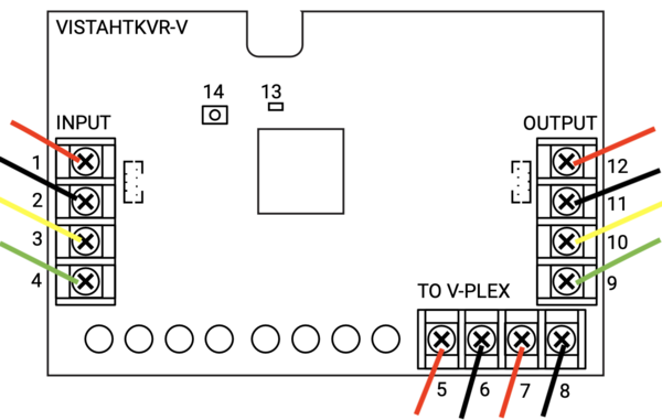 The VISTAHTKVR-V takeover module enables the integration of compatible serial V-PLEX devices with the VISTAH3 system. It connects to the VISTAH3's iBus terminals, providing connection points for serial V-PLEX devices. The module features an 'INPUT' for the panel's iBus wiring and an 'OUTPUT' for daisy-chaining to other iBus modules, simplifying installation by reducing the need for direct wiring back to the VISTAH3 panel.