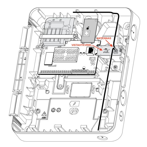 Install VISTAHTKVRWL takeover module. You can also install the VISTAHTKVRWL at this time. The takeover module slides over the connector on the right edge of the panel PCB, near the top. This module comes with two (2) antennas that must be installed. Without the included antennas, the reception range for legacy wireless devices will be severely compromised. Be sure to set the selector dial on the module for the appropriate legacy RF frequency prior to installation!