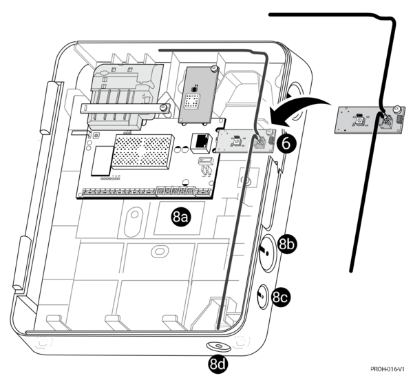 - Install PROWIFI or PROWIFIZW. If you will be using a PROWIFI (WIFI) or a PROWIFIZW (WIFI and Z-Wave Plus), you can install it by sliding it down over the edge connector at the top-right edge of the board. Be sure the module seats over the connector securely. Use the provided screw to secure the module to the VISTAH3 cabinet.