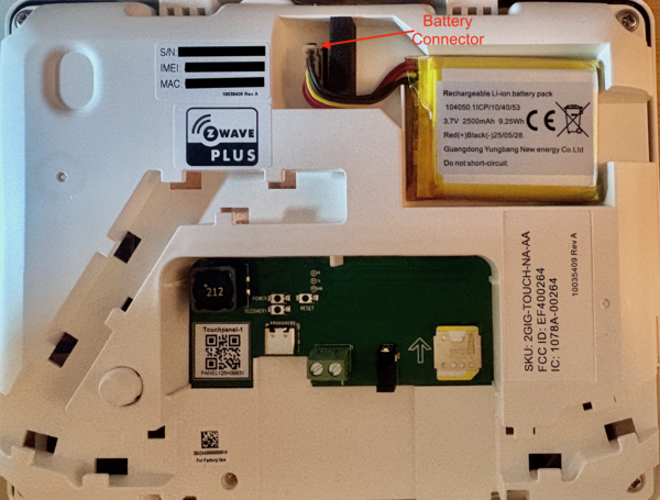 The 2GIG GC Touch (available in AT&T LTE and Verizon LTE versions) uses an AC to DC adapter for primary power and an internal lithium polymer battery for backup. The included power adapter accepts 100 to 240VAC at 50/60Hz and outputs 14VDC to power the panel. This universal AC input range allows the adapter to work throughout North America without requiring any additional adapters. The internal 2500mAh rechargeable battery (3.7V) provides backup power during electrical outages and charges automatically whenever primary power is available.