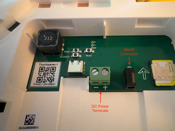 The GC Touch can use the same power cable as the 2GIG Edge. The 2GIG GG-EDGCBL is 9.8' (3m) in length and has spade lugs at one end, for connecting to the panel's DC power adapter, and a barrel connector at the other end, for connecting to the panel. If you require a longer wire run for power, you can use a custom wire length. This will connect to the Positive (+) and Negative (-) terminals on the back of the panel, next to the barrel connector.