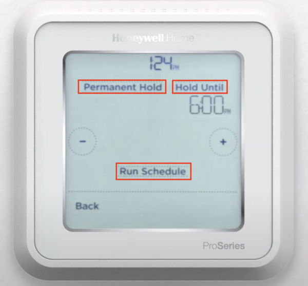 A hold tells a Honeywell Thermostat to ignore the scheduled temperature settings and keep the HVAC setting at a specified temperature. There are two main types of holds that are used. Temporary Hold (or Hold Until) will hold the temperature for a maximum of 12 hours. Permanent Hold will hold the temperature for an indefinite period of time until the hold is manually cancelled. There's also Vacation Hold that will hold the thermostat temperature until a specified date. Vacation Hold can only be set using the Resideo App.