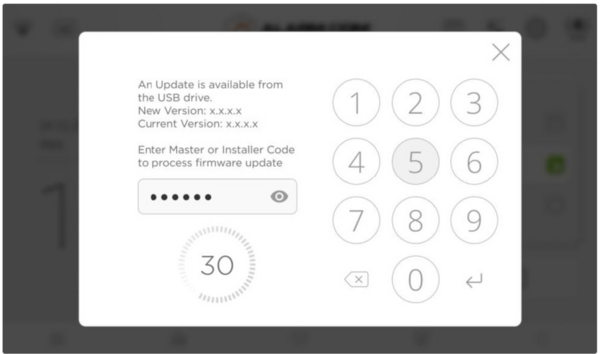 The 2GIG GC Touch supports local firmware updates via USB flash drive. Connect a drive containing the new firmware file in .zip format to the panel's rear Type-C port. When the panel detects the update, enter your Master Code or Installer Code to authorize and begin installation.