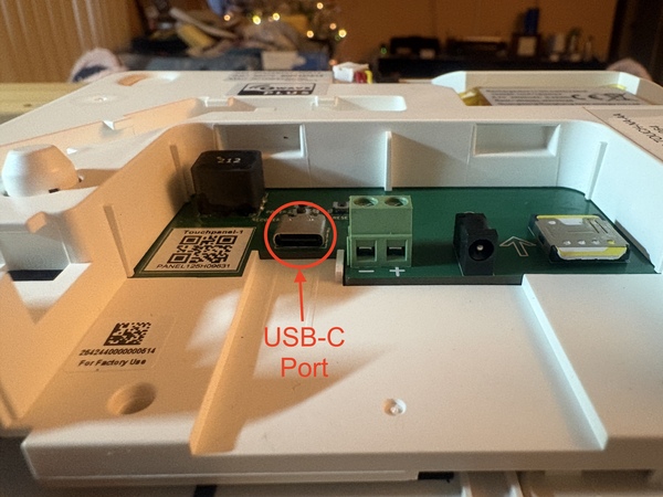 Dismount panel. If the panel is mounted, you'll need to dismount it to access the USB-C port for updating. Using a Phillips screwdriver, loosen the two retaining screws on the bottom edge of the panel. Pull the bottom edge of the panel forward and away from the back cover, then pull down from the top edge to free the panel. Using the same Phillips screwdriver, remove the set screw from the back cover to reveal the USB-C port.