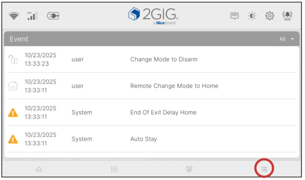 To view event history on the 2GIG GC Touch, tap the Events icon (≡) in the bottom navigation bar on the Home screen. No access code is required to open this page. The Event log records all system activity including arming, disarming, alarm triggers, trouble conditions, and bypassed zones.