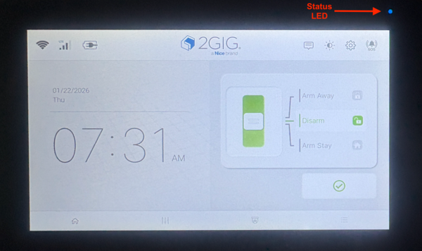 The 2GIG GC Touch features a multi-color LED located in the upper-right corner of the panel. It displays status at a glance. Solid blue indicates standby, solid red means armed or arming, flashing red shows an active alarm or entry delay, and solid white means the panel is not ready to arm.